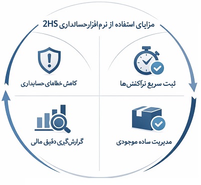 چرا 2HS مناسب است؟گزارش سود، بدهی، موجودی و فروش بهصورت شفاف،دید مدیریتی واقعی به کسبوکار،کاهش استرس مالی،افزایش کنترل و نظم،
