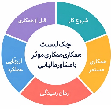 1. قبل از شروع همکاری:هدف مشخصی از همکاری با مشاور مالیاتی تعریف شده است(کاهش ریسک، برنامهریزی مالیاتی، رسیدگی، اعتراض، یا همه موارد)دامنه خدمات مشاور بهصورت شفاف مشخص شده است.سابقه، تجربه و تخصص مشاور متناسب با نوع کسبوکار بررسی شده است.قرارداد همکاری شامل مسئولیتها، حدود اختیارات و تعهدات دو طرف است.نقش حسابدار داخلی و مشاور مالیاتی از هم تفکیک شده است