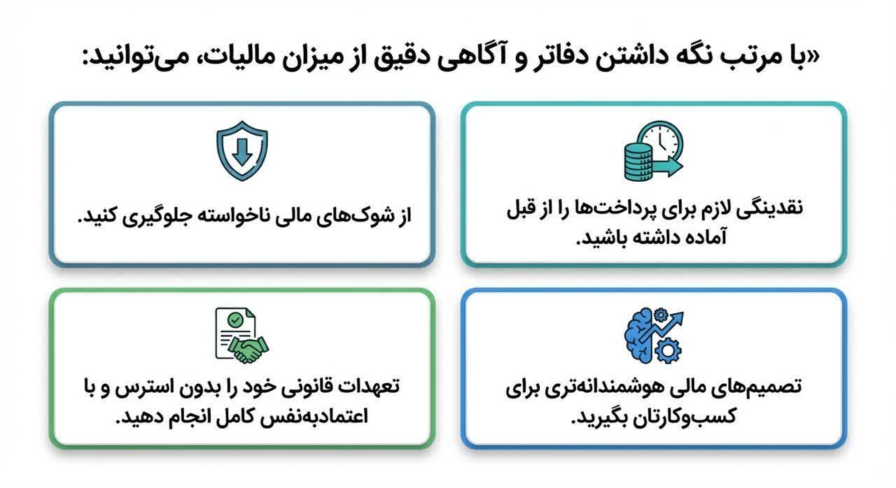 با مرتب نگه داشتن دفاتر و آگاهی دقیق از میزان مالیات، میتوانید: